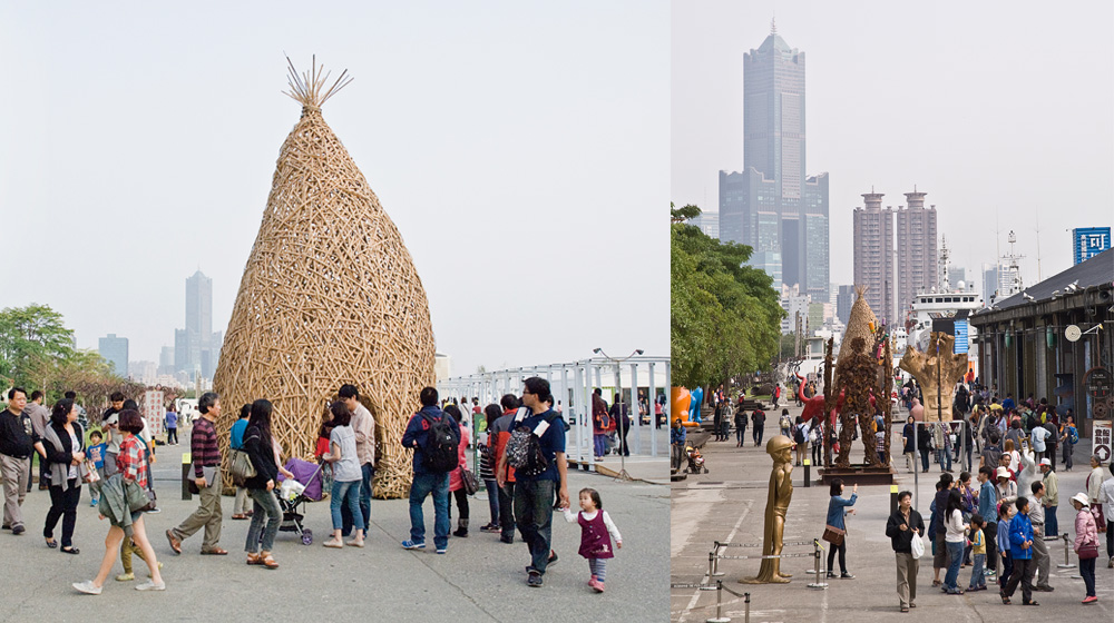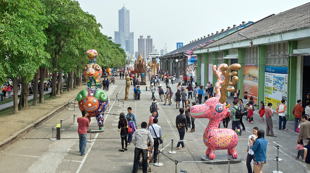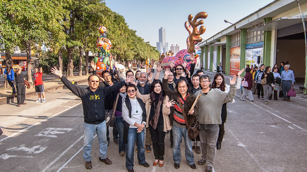 東和鋼鐵文化基金會董事長侯王淑昭女士、高雄市文化局長史哲、東和鋼鐵文化基金會祕書長劉柏村教授、策展人劉俊蘭教授與藝術家於駁二戶外展場合影
