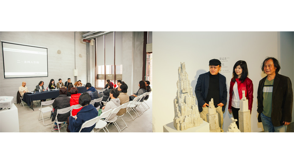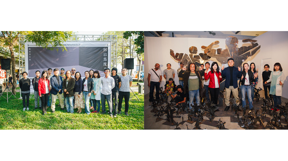 高雄市文化局長史哲、東和鋼鐵文化基金會秘書長劉柏村教授、策展人劉俊蘭教授與參展藝術家合影